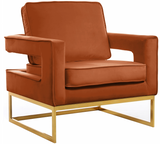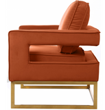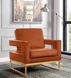 Helena Velvet Modern Accent Chair invites you to kick back and relax in style with this eye-catching velvet accent chair. Featuring a unique, sleek modern design, this chair's velvet upholstery and gold stainless steel base is both plush and durable. The chair's cushion is padded with high-density foam, ensuring absolute comfort while you sit and read or watch TV.