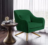 The Pleat Modern Swivel Chair bost style and function. Its roomy design, plush cushions, and pillows ensure comfort while you sit, and its unique color is sure to catch the eye of all who visit your home. Soft velvet upholstery satisfies your textural senses, and a gold metal swivel base adds elegance while enabling you to turn freely while you sit and read your favorite book. Several color options.