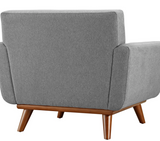 Gently sloping curves and large dual cushions create a favorite lounging spot. Whether plopping down after a long day at work, settling in with coffee and brunch, or entering a spirited discussion with friends, the Ronald accent chair is a welcome presence in your home. Tufted buttons create eye catching appeal; adding depth that brings your sitting decor to center stage. Four cherry color rubber wood legs and frame supply a solid base to the comfortable upholstered material. Mid-century modern style at its best.