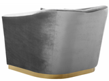 The Slope Modern Accent Chair is graceful and stylish. This handsome sofa is upholstered in velvet for a glamorous touch and is accented with gold stainless steel around its base for a touch of modernity. Its curvy back gives it a graceful look in your living room or den, and it comes with coordinating throw pillows that beckon you to sit down and rest (or nap) for a spell.