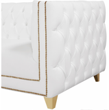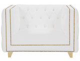 The Vix accent chair embodies style and opulence. The White Faux leather paired with the gold nailhead trim and tufted detail gives this chair a commanding presence. Great for any area where durable and stylish seating is needed.