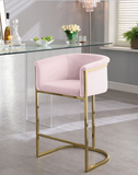 The Dwell Modern Counter Stool invites you to take a seat. Its curved design and rich velvet upholstery provide a comfortable, soft, luxurious seat for you to relax in, while also adding a touch of elegance to your living space. Its gold steel base adds the perfect balance to the stool, in addition to holding the stool up to counter height and providing durable support for years to come.