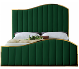 The Sway Modern Bed is modern and eye-catching. Transform your bedroom into a dream haven with the breathtaking bed. Featuring a stunning polished gold metal frame that supports velvet upholstery on the headboard and footboard with channel tufting for texture, this sleek bed not only commands your attention, it demands it. The wavy design of the headboard and footboard evokes a dramatic image reminiscent of a boat rolling on the waves at sea, promising to lull you to sleep and reward you with a night of pleasant dreams.