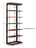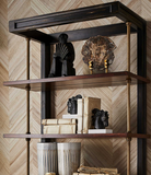 The Jameson Etagere has antique brass finished iron support rods suspend dark honey stained display shelves, encased in an open style mango wood frame, and hand rubbed in worn black with honey undertones.