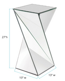 This stunning mirrored end table has a twisted mirrored effect design. Its rectangular form is twisted creating angular planes that make for the most amazing displays of light and reflections. Each mirrored panel has a small bevel that adds to the table's style and beauty. Every surface is mirrored. This mirrored pedestal will look great in an entryway, hallway, living room or any place you need a pedestal!