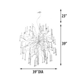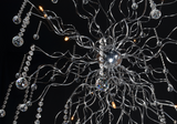 This modern chandelier has a sun burst effect of squiggly chrome arms and each is adorned with a crystal pendant. This unique design is modern and sleek and adds a unique ambiance to any space. Perfect for a foyer or even a dining table.
