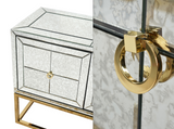 The Marbled Mirrored Long Cabinet is great where storage is needed or a large space needs to be filled.  The cabinet is over 6' long and has a beautiful antique mirror finish. Contemporay design - Marbled mirror glass with gold highlights- Touch open Doors - one interior shelf - Great for a TV Platform, Foyer, or Dining Room.