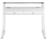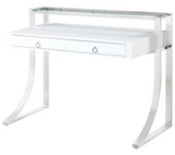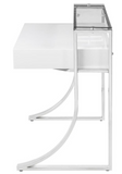 The Slater Desk is sleek and curved. Add an edge of contemporary flair to any living space. This sleek, stylish writing desk exudes glamorous appeal. Its eye-catching frame is expertly crafted with a gracefully curved silhouette. Its gorgeous, glossy white surface blends appealingly with its shining chrome legs. Complete with two felt-lined drawers with full extension glides, this desk enhances any home office with convenience and modern style.