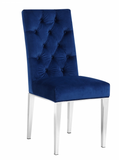 The Jamie Dining Chair S/2. This chair has a parson's design for a sleek, contemporary look with just a hint of traditional flair. The stainless steel base is sturdy and strong, so it holds up well to everyday use. A robust chrome finish lends it modern elegance, while navy velvet upholstery is plush and welcoming, ensuring you stay comfortable all throughout the meal. 3 color available. Sold and priced in S/2. Pairs well with the Jamie Dining Table