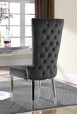 The LaFlare Dining Chair boasts Its luxurious velvet upholstery and is both soft and elegant, adding a chic touch to your home. Its high back with a deep button tufted design gives this stylish chair a regal appearance, while rich chrome metal legs complement its black color while providing sturdy support to the chair's frame.