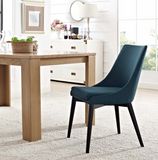 The Ontario Dining Chair has a mid century modern look. The polyester fabric chair comes in different colors and tapered wood legs coated in black. Perfect for the clean modern interior. Use in the dining room, kitchen, or at the desk.