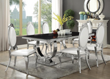 The Ovation dining table is large and beautiful. Create an opulent air of sophistication with this elegant dining table. A long and spacious tabletop seats eight guests rather comfortably. Slide up a chair beneath its opaque black tempered glass surface for formal dinners and casual gatherings. Supporting the tabletop is a trestle-inspired stainless steel base with ring-shaped end supports, all of which boast a gleaming chrome finish that reflects the dining room's color palette like a chic mirror. Pairs well with the LaPearla Dining Chairs.
