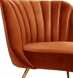 Maggie Chaise Lounge is sleek and stylish. This contemporary chaise features plush velvet upholstery that is both classy and sumptuous against your skin, a single seat cushion and rounded arms that curve into a low, rounded back, creating a perfect, modern piece for your home. Gold stainless steel legs support this chaise and provide a stunning contrast to the chaise's plush fabric. Several color options.