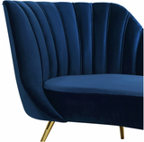 Maggie Chaise Lounge is sleek and stylish. This contemporary chaise features plush velvet upholstery that is both classy and sumptuous against your skin, a single seat cushion and rounded arms that curve into a low, rounded back, creating a perfect, modern piece for your home. Gold stainless steel legs support this chaise and provide a stunning contrast to the chaise's plush fabric. Several color options.