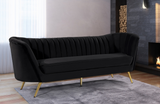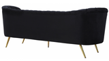 Maggie Chaise Lounge is sleek and stylish. This contemporary sofa features plush velvet upholstery that is both classy and sumptuous against your skin, a single seat cushion and rounded arms that curve into a low, rounded back, creating a perfect, modern piece for your home. Gold stainless steel legs support this sofa and provide a stunning contrast to the sofa's plush fabric.
