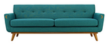 Gently sloping curves and large dual cushions create a favorite lounging spot. Whether plopping down after a long day at work, settling in with coffee and brunch, or entering a spirited discussion with friends, the Ronald sofa is a welcome presence in your home. Seven tufted buttons create eye catching appeal; adding depth that brings your sitting decor to center stage. Four cherry color rubber wood legs and frame supply a solid base to the comfortable upholstered material. Mid-century modern style at its best.