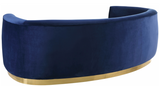The Shell curved sofa is the perfect mix of velvet and gold stainless steel that comes to life in your space with this curved Sofa. This bold velvet sofa comes upholstered in rich, Sumptuous-to-the-touch velvet to make a fashionable statement in your space. The curved back design lends it a modish touch, and the gold stainless steel trim around its base adds to its glitzy appeal. Stage this sofa alone or with other pieces to wow your guest.
