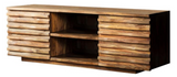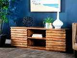 The Stackhouse Modern Wood TV console is simple and clean. Give your living room a global-inspired feel with this rustic TV console. Designed with solid Sheesham wood that lends a gorgeous wood grain details and markings, this console makes a warm, striking addition to a home. A spacious top accommodates up to a 48-inch TV with plenty of storage space for DVDs, CDs and entertainment consoles in the storage space below. Two large open shelves keep decor and an entertainment system, while two cabinets conceal clutter and other items. A fingertip pull on each of the cabinet doors allows for a seamless horizontal plank facade that offers a visual texture to a space.