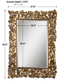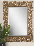 The Fragment Wall mirror has a unique flare. Metal strips are welded together to create this ornate frame. The antiqued gold leaf finish has a light gray glaze. Mirror has a generous 1 1/4" bevel. May be hung horizontal or vertical.