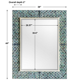 The scales wall Mirror is vibrant and interesting. This unique design takes a whimsical approach by adorning a solid wood frame with fiber glass mermaid scales, hand painted in shades of tropical blues, accented with a heavy white wash. Mirror is beveled. May be hung horizontal or vertical.