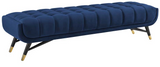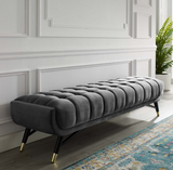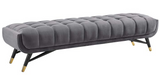 Embolden your living room décor with the Tipper Modern bench. Featuring a blend of chic, contemporary, and mid-century modern design, It's broad profile, deep seating, generous tufting, stain-resistant velvet polyester upholstery, and subtle metal accents imbue rich detail and chic sophistication. Enjoy the plush comfort of the Tipper bench while lounging with friends and family. Resting atop a splayed black birchwood frame with gold metal end caps, It is a striking addition to the home or apartment. Bench Weight Capacity: 440 lbs.