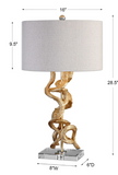 Inspired from real twisted vines, this lamp has a bright gold leaf finish accented with a thick crystal foot and matching finial. The round hardback drum shade is an oatmeal linen fabric.