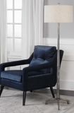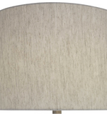 The Caviat Floor Lamp is sleek and modern. Tapered cast iron with a subtle textured surface, with a raw steel finish and burnished distressing. The round hardback drum shade is a light beige linen fabric with natural slubbing.