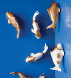The Gold Koi Fish wall decor is fun and stylish. The set includes two different shapes and colors of swimming koi fish. A great story can be told by the way each piece is installed. This three-dimensional textural wall art offers durability, endless creativity and versatility. Designed for easy installation by individually mounting directly to your wall, these little art forms create an inexpensive giant impact when massed together. They actually can be attached to almost anything.