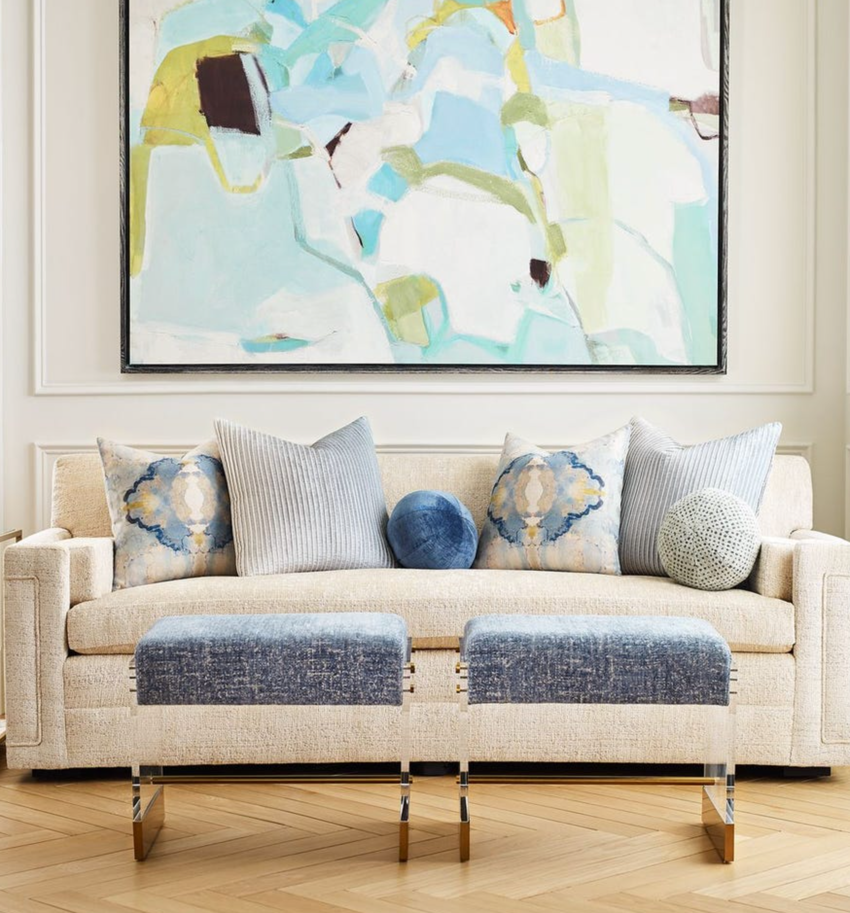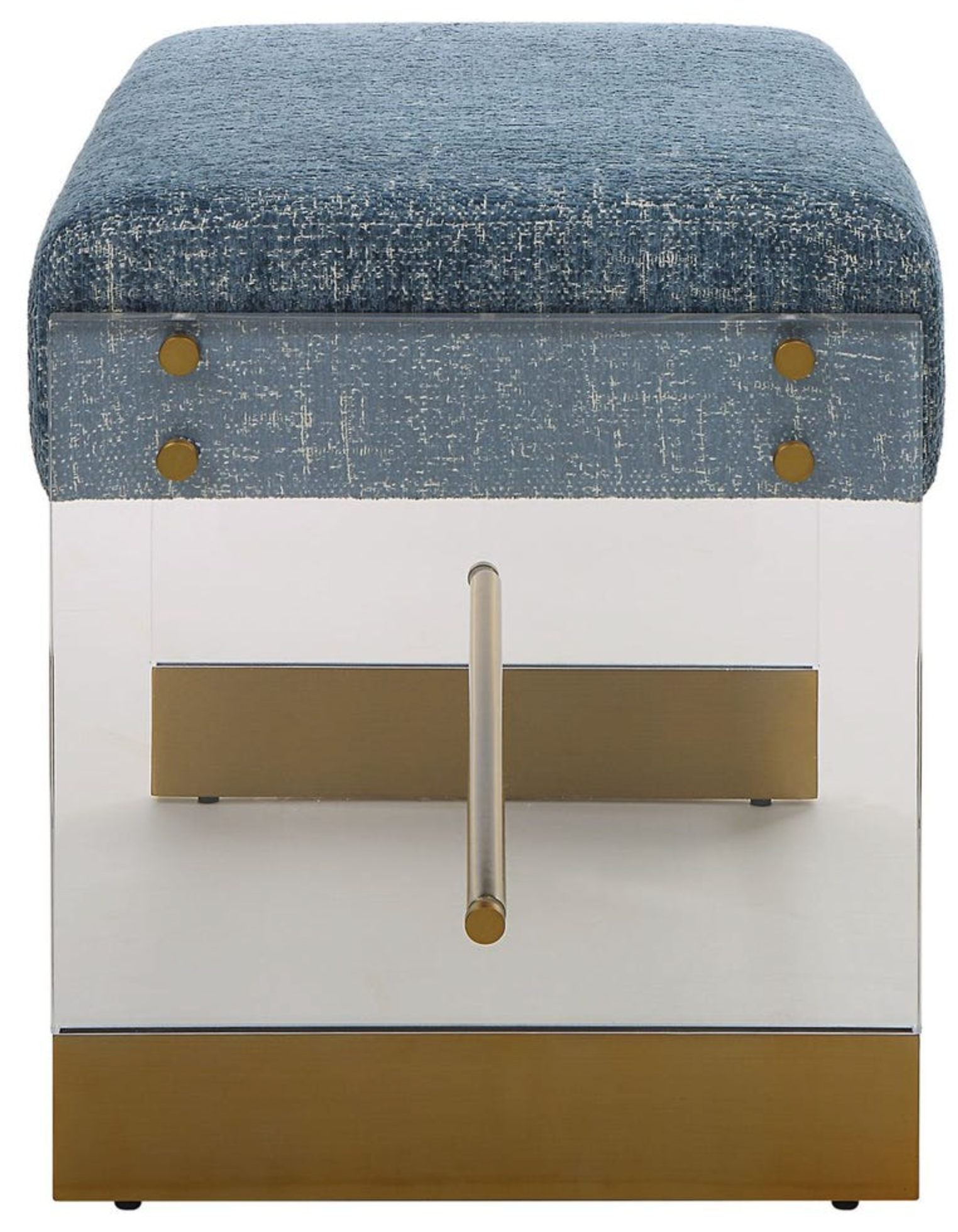 The Bellvue Acrylic and Gold bench is simple and stylish. A luscious, plush blue fabric seems to float in mid air, supported by jewel-like acrylic legs. The stainless steel leg bases, bolts, and stretcher have been finished in brushed antique brass. The bench is made with performance fabric, to resist staining, and its waterfall edge creates a crisp, clean look.